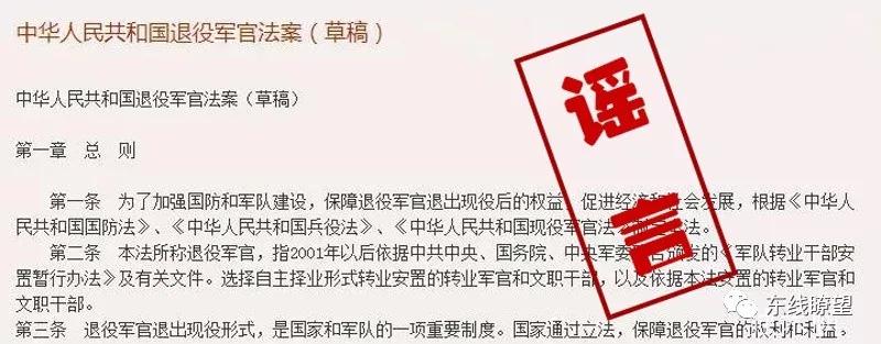 真相:經(jīng)調(diào)查,所謂的《退役軍官法案》早在2013年就出現(xiàn)在網(wǎng)絡(luò)上,今年乘著退役軍人事務(wù)部成立的“東風(fēng)”再一次火了起來。這些假法規(guī)之所以能夠流行,因?yàn)樗麄兏袷缴峡雌饋肀容^正規(guī),各種要素都有,并且往往涉及到戰(zhàn)友們和廣大軍屬的切身利益,具有很強(qiáng)的迷惑性和煽動(dòng)性。其實(shí),識(shí)別真?zhèn)蔚姆椒ㄖ挥幸粭l——等權(quán)威部門公布權(quán)威消息!