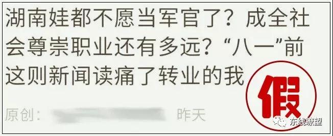 事件:7月11日,一家媒體發(fā)布《湖南省內(nèi)公費(fèi)定向師范生和軍校本科征集志愿計(jì)劃公布》,文中提到湖南省“軍事院校本科計(jì)劃(男)征集志愿缺額為18人,全部為理工類;(女)征集志愿缺額為3人,同樣均為理工類,其中陸軍特種作戰(zhàn)學(xué)院缺額達(dá)2人?!边@條新聞迅速成為引燃輿情的導(dǎo)火索,很快,多個(gè)自媒體開始推送“湖南娃都不愿當(dāng)軍官了”“軍校招生在湖南乃至全國遇冷”的系列網(wǎng)文,文中出現(xiàn)了諸如“武警院校招生缺口率高達(dá)一半以上”“山東省未完成招生計(jì)劃的軍校有10所”等虛假數(shù)據(jù),并把矛頭直接指向軍校、軍隊(duì),甚至發(fā)展到抹黑軍隊(duì)、顛倒是非、擾亂軍心。