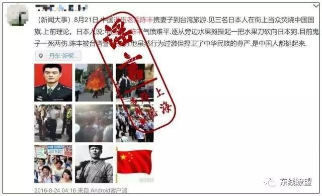 事件:今年3月,有一熱傳網(wǎng)帖稱:“退伍老兵陳豐”攜妻子到寶島臺(tái)灣旅游,見3名日本人在街上當(dāng)眾焚燒五星紅旗,雙方產(chǎn)生沖突,導(dǎo)致一死二傷。網(wǎng)帖還稱,我國臺(tái)灣地區(qū)已經(jīng)有513名警察參與到聯(lián)名中來,并且人數(shù)還在不斷增加,這名老兵雖然沖動(dòng),但是為了國家和民族的榮譽(yù),呼吁網(wǎng)友們轉(zhuǎn)發(fā)支持“陳豐”。