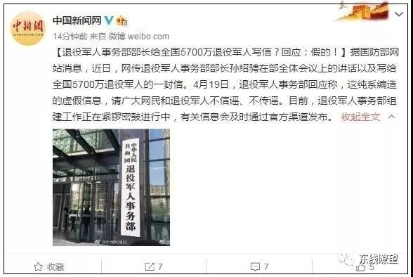 真相:4月19日,退役軍人事務(wù)部及時(shí)辟謠:網(wǎng)傳孫紹騁部長(zhǎng)在部全體會(huì)議上的講話以及寫給全國退役軍人的一封信,純系編造的虛假信息,請(qǐng)廣大網(wǎng)民和退役軍人不信謠、不傳謠。同時(shí),退役軍人事務(wù)部專門發(fā)消息提出,有關(guān)退役軍人事務(wù)部的信息,應(yīng)以官方發(fā)布為準(zhǔn)。一年來,退伍軍人事務(wù)部干了很多實(shí)實(shí)在在的事情,就是為了讓更多的退伍軍人能夠更快地感受組織的溫暖,獲得前進(jìn)的巨大力量。