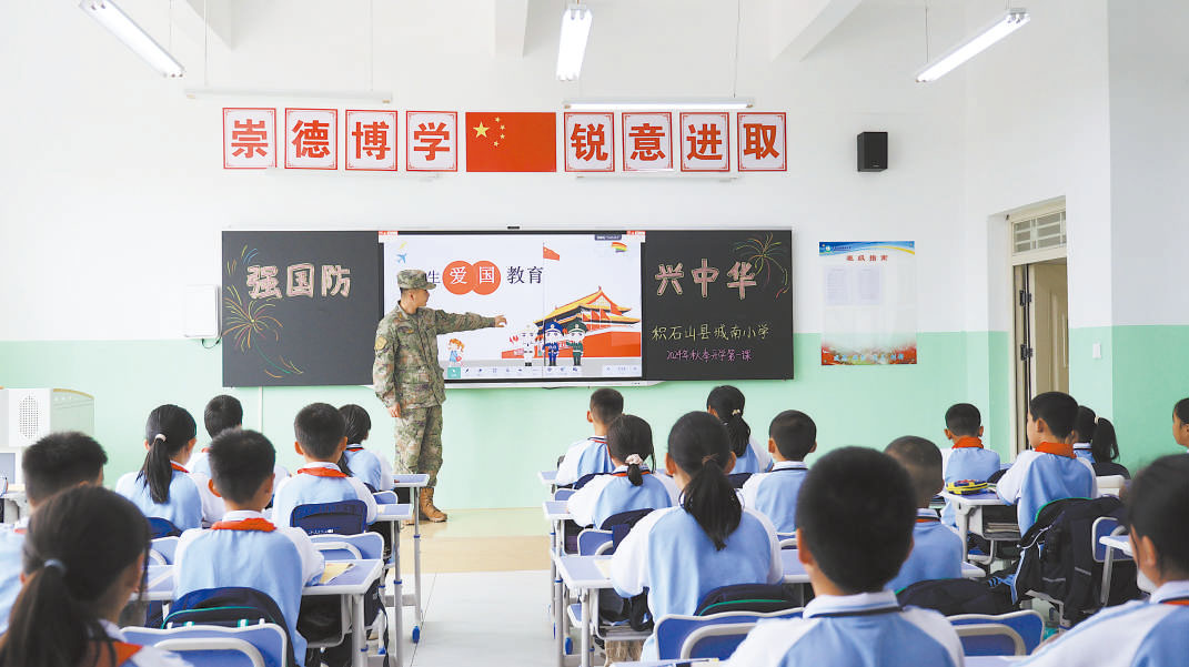 新學(xué)期伊始,甘肅省積石山縣人武部文職人員走進(jìn)城南小學(xué)新修繕的校舍宣講國(guó)防知識(shí),為學(xué)生們上“開(kāi)學(xué)第一課”。馬瑜 攝