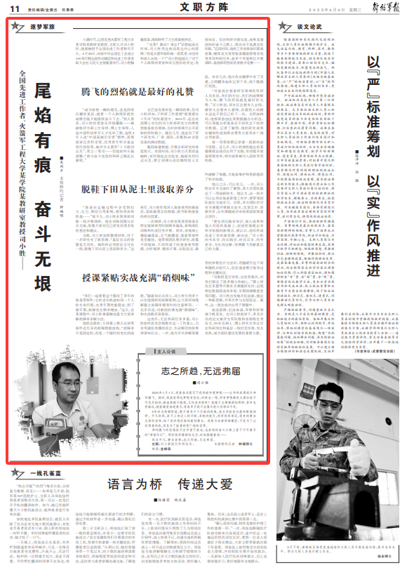 “要在消化既有知識、前人成果和他人經(jīng)驗(yàn)的基礎(chǔ)上,創(chuàng)造性地提出有科學(xué)依據(jù)的新觀點(diǎn)、新認(rèn)識,進(jìn)而形成改進(jìn)工作的新思路、新辦法?!彼拘傧驎緦W(xué)、向?qū)嵺`學(xué)、向官兵學(xué)、向?qū)<覍W(xué),為長劍出鞘、導(dǎo)彈騰飛貢獻(xiàn)著自己的力量。
