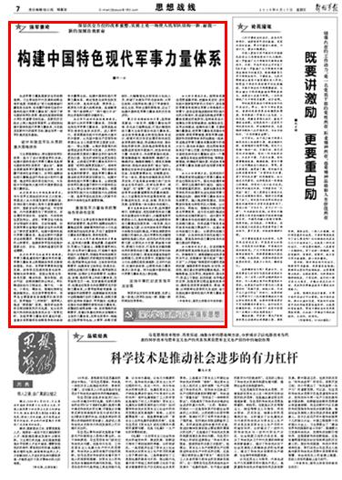 習(xí)主席站在時(shí)代發(fā)展和戰(zhàn)略全局的高度,明確提出“努力構(gòu)建能夠打贏信息化戰(zhàn)爭(zhēng)、有效履行使命任務(wù)的中國(guó)特色現(xiàn)代軍事力量體系”,指明了深化國(guó)防和軍隊(duì)改革、建設(shè)鞏固國(guó)防和強(qiáng)大軍隊(duì)的重要目標(biāo)任務(wù)。在新的歷史起點(diǎn)上深入推進(jìn)改革強(qiáng)軍,必須加快構(gòu)建中國(guó)特色現(xiàn)代軍事力量體系,為實(shí)現(xiàn)黨在新時(shí)代的強(qiáng)軍目標(biāo)、建設(shè)世界一流軍隊(duì)奠定堅(jiān)實(shí)基礎(chǔ)。請(qǐng)關(guān)注今日出版的《解放軍報(bào)》的文章——