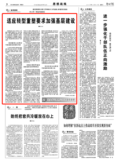 基層是部隊全部工作和戰(zhàn)斗力的基礎(chǔ),抓基層打基礎(chǔ)的工作一刻也不能放松。當(dāng)前,國防和軍隊建設(shè)進(jìn)入新時代、邁向新征程,必須順勢而為、因勢而動,在緊跟步伐中立起遵循,在標(biāo)定方位中把握規(guī)律,在找準(zhǔn)重點中精準(zhǔn)發(fā)力,著力推動基層建設(shè)全面進(jìn)步、全面過硬。請關(guān)注今日出版的《解放軍報》的文章——