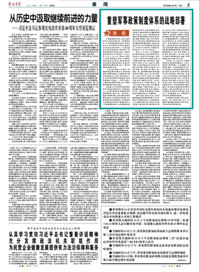 軍事政策制度改革,是深化國防和軍隊(duì)改革的重要內(nèi)容,又是重要保證。中央軍委政策制度改革工作會議的召開,標(biāo)志著軍隊(duì)改革向全面勝利的目標(biāo)邁出決定性步伐。習(xí)主席出席會議并發(fā)表重要講話,深刻闡述了軍事政策制度改革的重大意義、戰(zhàn)略舉措和落實(shí)要求,科學(xué)回答了“為什么改、改什么、怎么改”等重大問題。習(xí)主席的重要講話,體現(xiàn)了中國特色強(qiáng)軍之路的時(shí)代要求,具有很強(qiáng)的政治性思想性戰(zhàn)略性創(chuàng)新性,是黨的軍事指導(dǎo)理論最新成果,是又一篇改革強(qiáng)軍的綱領(lǐng)性文獻(xiàn)。