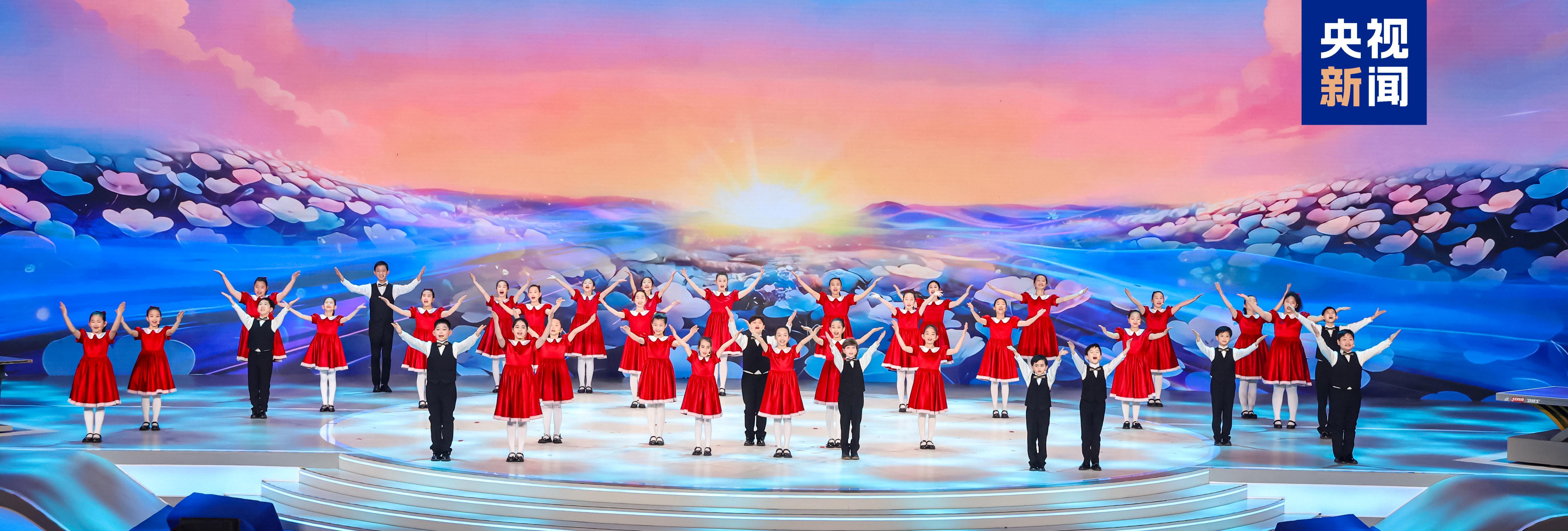 △中美“乒乓外交”55周年紀(jì)念大會上,中美青少年合唱歌曲《銀球飛舞花盛開》。