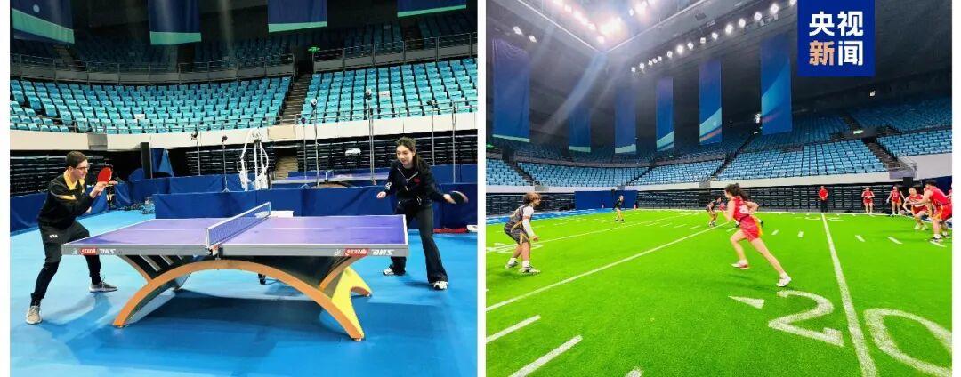 △中美“乒乓外交”55周年紀(jì)念大會現(xiàn)場,中美乒乓球與橄欖球跨項目互動體驗。