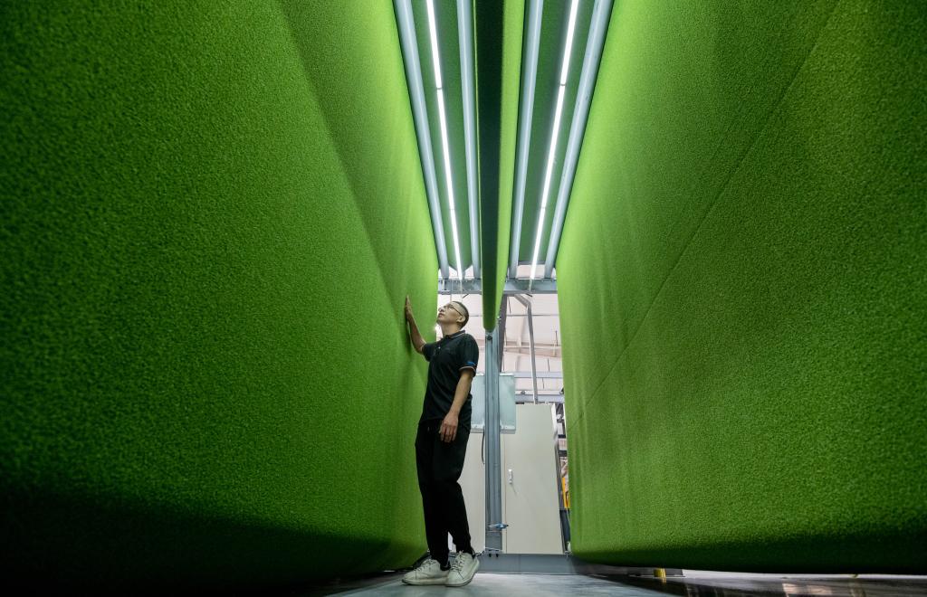 在山東省樂陵市泰山體育產(chǎn)業(yè)集團(tuán)人造草坪智能化生產(chǎn)車間,工人在檢測(cè)產(chǎn)品。新華社記者 范長(zhǎng)國(guó) 攝