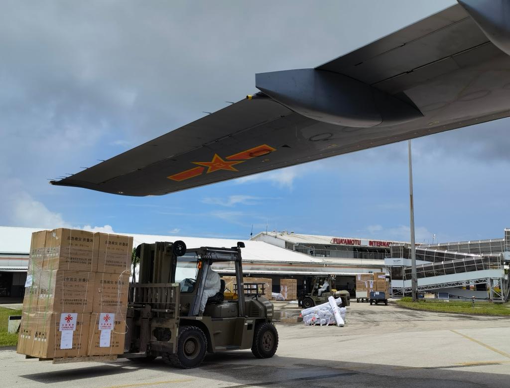 工作人員在湯加首都努庫(kù)阿洛法機(jī)場(chǎng)卸載中國(guó)運(yùn)-20飛機(jī)運(yùn)送來(lái)的援助物資(2022年1月28日攝,手機(jī)照片)。新華社記者 丁增義 攝