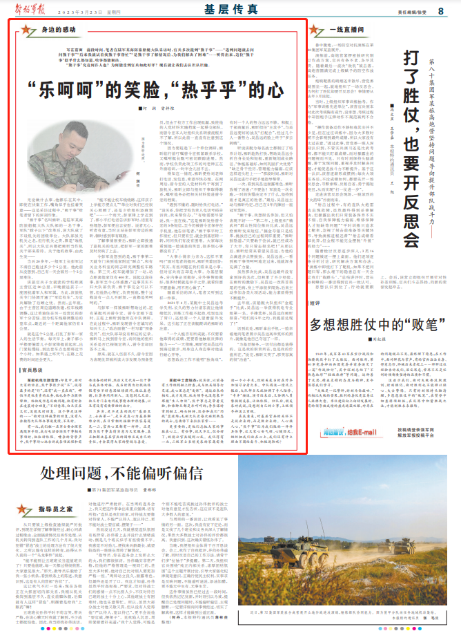 其實(shí),是不是真的踐行“基層至上、士兵第一”,是不是真心為基層解難分憂,在日常相處接觸中很容易窺見一二,官兵心里都有一桿秤。正是因?yàn)樾芨墒抡媲閷?shí)意為大家服務(wù),真正把解決基層官兵的困難當(dāng)成自己的責(zé)任,才會獲得大家的贊揚(yáng)與喜愛。