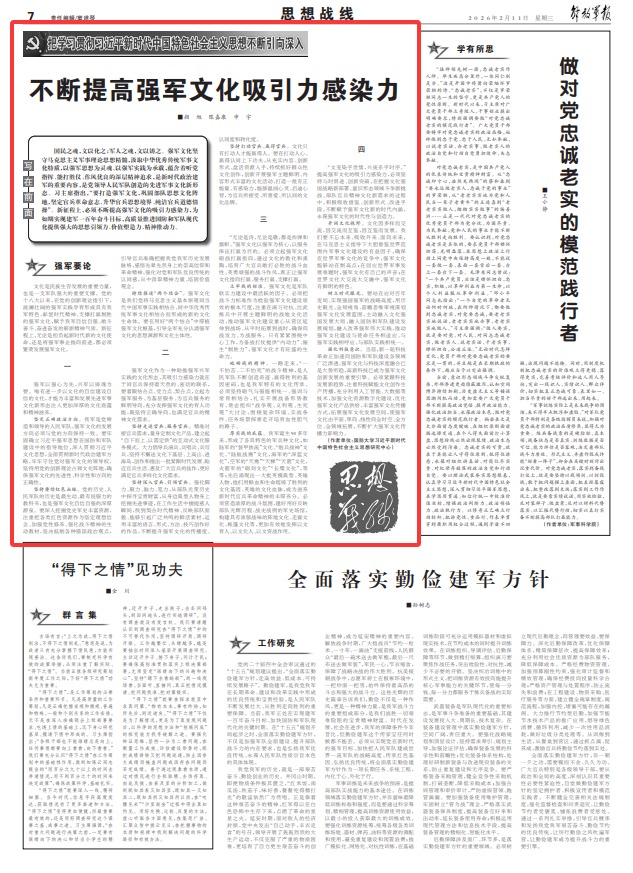 強軍以強心為先,興軍以鑄魂為要。唯有進一步以文化的自信建設自信的文化,才能為豐富和發(fā)展先進軍事文化新形態(tài)注入更加深厚的文化底蘊和精神滋養(yǎng)。