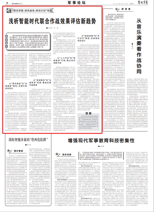聯(lián)合作戰(zhàn)效果評估是打贏信息化智能化戰(zhàn)爭不可或缺的關(guān)鍵環(huán)節(jié)。作為“度量衡”的聯(lián)合作戰(zhàn)效果評估,能夠?yàn)橹笓]提供決策依據(jù),為戰(zhàn)斗力提升指引方向,既是檢驗(yàn)聯(lián)合訓(xùn)練和作戰(zhàn)方案的“試金石”,也是驅(qū)動軍隊(duì)聯(lián)合能力螺旋式上升的“發(fā)動機(jī)”。面對未來戰(zhàn)爭的高度復(fù)雜性,唯有構(gòu)建起一套科學(xué)、精準(zhǔn)、高效的聯(lián)合作戰(zhàn)效果評估體系,才能在戰(zhàn)場上真正做到知己知彼、運(yùn)籌帷幄、決勝千里。