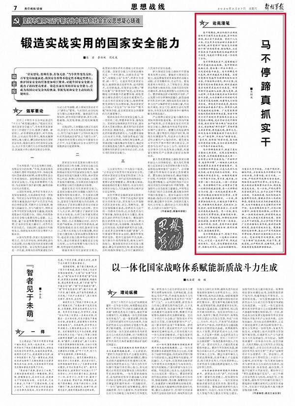 馬不停蹄真抓實(shí)干,首要根植于絕對(duì)忠誠(chéng)的政治品格。馬不停蹄的疾馳之姿,象征著一種永不懈怠、一往無前的奮斗狀態(tài)。馬不停蹄是外化表現(xiàn),絕對(duì)忠誠(chéng)是內(nèi)在根基。沒有對(duì)黨絕對(duì)忠誠(chéng)作為精神內(nèi)核和動(dòng)力源泉,干勁就難以持久、難以匯聚;沒有堅(jiān)守戰(zhàn)位的勇毅承擔(dān),絕對(duì)忠誠(chéng)就易淪為徒有其表的空泛表態(tài)。唯有將絕對(duì)忠誠(chéng)融入血脈、鑄入靈魂、嵌入使命,才能真正激發(fā)出永不枯竭的奮斗力量,從而在強(qiáng)軍興軍的時(shí)代號(hào)角感召下策馬揚(yáng)鞭,向著偉大目標(biāo)奮勇進(jìn)發(fā)。理論是行動(dòng)的先導(dǎo),黨的創(chuàng)新理論涵養(yǎng)著共產(chǎn)黨人、革命軍人絕對(duì)忠誠(chéng)的政治品格。廣大官兵要持續(xù)深化黨的創(chuàng)新理論武裝,堅(jiān)持不懈用習(xí)近平新時(shí)代中國(guó)特色社會(huì)主義思想凝心鑄魂,突出學(xué)好習(xí)近平強(qiáng)軍思想,深刻領(lǐng)悟“兩個(gè)確立”的決定性意義,堅(jiān)決做到“兩個(gè)維護(hù)”,貫徹軍委主席負(fù)責(zé)制,將忠誠(chéng)之魂、強(qiáng)軍之志,轉(zhuǎn)化為馬不停蹄真抓實(shí)干的扎實(shí)行動(dòng),以“朝受命、夕飲冰”的緊迫感,“晝無為、夜難寐”的責(zé)任感,奮力跑好歷史的接力棒,全力打好實(shí)現(xiàn)建軍一百年奮斗目標(biāo)攻堅(jiān)戰(zhàn)。