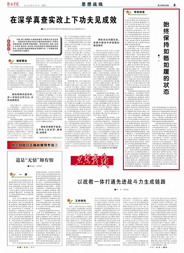 習(xí)主席在中共中央政治局民主生活會(huì)上強(qiáng)調(diào),要“始終保持本色、安守本分,如臨如履、謙虛謹(jǐn)慎”,為領(lǐng)導(dǎo)干部特別是高級(jí)干部立身處世、為官用權(quán)立起了根本標(biāo)尺,提供了方向指引。今天,在全面推進(jìn)中國(guó)式現(xiàn)代化的新征程上,在“十五五”開局起步的新起點(diǎn)上,我們比歷史上任何時(shí)期都更接近、更有信心和能力實(shí)現(xiàn)中華民族偉大復(fù)興的目標(biāo),但也必須清醒認(rèn)識(shí)到:越是接近目標(biāo),越要凝心聚力;越是取得成績(jī),越要如臨如履,不能有任何松勁歇腳、疲勞懈怠的情緒。