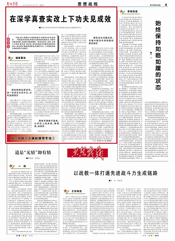 整改須向?qū)嵦幝?,?shí)效自從較真來。深學(xué)是思想筑基,真查是刀刃向內(nèi),而實(shí)改則是破題見效,這在很大程度上決定著學(xué)習(xí)教育的實(shí)際成效,容不得半點(diǎn)虛功、半點(diǎn)敷衍。必須把問題清單轉(zhuǎn)化為整改清單、把承諾舉措轉(zhuǎn)化為實(shí)干成果,以釘釘子精神糾偏正向、整改落實(shí),真正把正確政績觀落到推動(dòng)強(qiáng)軍事業(yè)高質(zhì)量發(fā)展的各領(lǐng)域全過程。