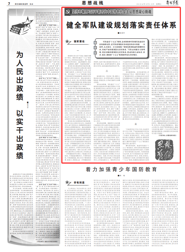 “任重者其憂不可以不深,位高者其責(zé)不可以不厚。”嚴(yán)密的規(guī)劃落實責(zé)任體系,不僅是方法論,更是認(rèn)識論;不僅是工作要求,更是政治擔(dān)當(dāng)。如何讓這套體系真正運轉(zhuǎn)起來、發(fā)揮作用,需要多條路徑發(fā)力,實現(xiàn)壓力層層傳導(dǎo)、動力級級提升,確保軍隊建設(shè)“十五五”規(guī)劃落實錨定目標(biāo)、穩(wěn)步前行。