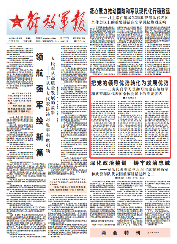 習(xí)主席在出席十四屆全國(guó)人大四次會(huì)議解放軍和武警部隊(duì)代表團(tuán)全體會(huì)議時(shí)強(qiáng)調(diào),完成“十五五”時(shí)期國(guó)防和軍隊(duì)現(xiàn)代化目標(biāo)任務(wù),歸根到底要靠各級(jí)黨組織來(lái)領(lǐng)導(dǎo)和推進(jìn)。這一重要講話(huà),站在黨和國(guó)家事業(yè)全局高度,深刻闡述了黨的領(lǐng)導(dǎo)和黨的建設(shè)對(duì)于如期實(shí)現(xiàn)建軍一百年奮斗目標(biāo)、高質(zhì)量推進(jìn)國(guó)防和軍隊(duì)現(xiàn)代化的重大意義,為凝心聚力推動(dòng)國(guó)防和軍隊(duì)現(xiàn)代化行穩(wěn)致遠(yuǎn)提供了根本遵循。