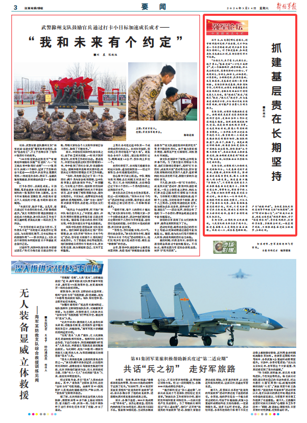 長期堅持,必須踐行正確政績觀。人民軍隊的生命力在于戰(zhàn)斗力,抓建基層根本上是圍繞打贏出政績。脫離這一點,就容易急躁短視,產(chǎn)生“政績沖動”。各級黨委機(jī)關(guān)特別是領(lǐng)導(dǎo)干部應(yīng)克服“任期思維”,摒棄“即時回報心態(tài)”,以“功成不必在我,功成必定有我”的境界胸懷,甘于“寂寞的長跑”,尊重客觀規(guī)律,堅持科學(xué)決策,多做調(diào)查研究,一張藍(lán)圖干到底,不斷推動基層建設(shè)全面進(jìn)步、全面過硬。