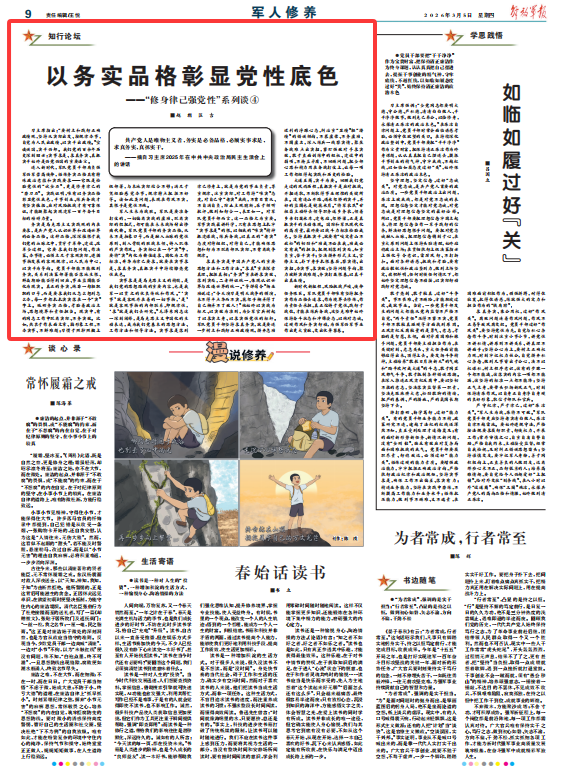 進(jìn)入新時(shí)代,軍隊(duì)黨員干部肩負(fù)強(qiáng)軍興軍崇高使命,錘煉務(wù)實(shí)品格具有特殊政治意蘊(yùn)和實(shí)踐要求——它既是檢驗(yàn)黨性的“試金石”,更是修身律己的“磨刀石”。實(shí)踐證明,唯有以務(wù)實(shí)品格彰顯黨性底色,干事創(chuàng)業(yè)、練兵備戰(zhàn)才有堅(jiān)實(shí)依據(jù),應(yīng)對(duì)風(fēng)險(xiǎn)挑戰(zhàn)才有可靠保證,才能凝聚起實(shí)現(xiàn)建軍一百年奮斗目標(biāo)的磅礴力量。