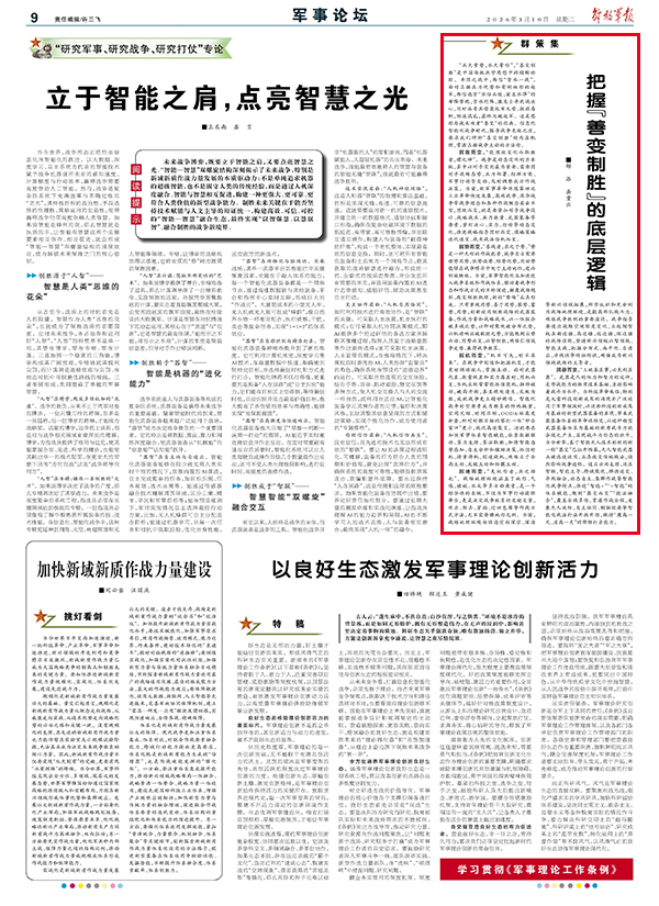 “兵無常勢,水無常形”。“善變制勝”是中國傳統(tǒng)兵學思想中的精髓論斷。井陘之戰(zhàn)中,韓信“背水一戰(zhàn)”。面對占據(jù)兵力優(yōu)勢和有利地形的趙軍,韓信違背“右倍山陵,前左水澤”的布陣常規(guī),背水列陣,激發(fā)士卒死戰(zhàn)決心,同時派奇兵偷襲趙軍大營,拔旗易幟,制造混亂,最終大破趙軍。這是思維與戰(zhàn)術(shù)雙重“善變”的經(jīng)典。信息化智能化戰(zhàn)爭時代,探尋戰(zhàn)爭克敵之道,要求我們研析“善變制勝”的內(nèi)在機理,掌握占據(jù)戰(zhàn)爭主動的方法論。