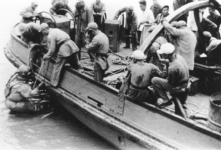 便橋施工于5月1日正式開始,正趕上淮河汛期,由于水深流急,施工中遇到了許多意想不到的困難。為保證每一個木籠沉箱準(zhǔn)確沉放到指定的墩位,3支隊抽出所有會潛水的戰(zhàn)士組成潛水隊,承擔(dān)為木籠沉箱的吊裝定位拴掛鉤、拴鋼絲繩、水下正位的重任。王吉珍擔(dān)任了潛水隊隊長。