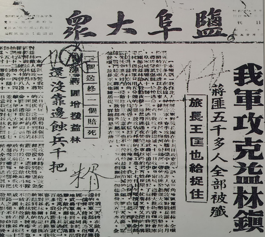 ▲1948年3月25日《鹽阜大眾》報道“我軍攻克益林鎮(zhèn)”。