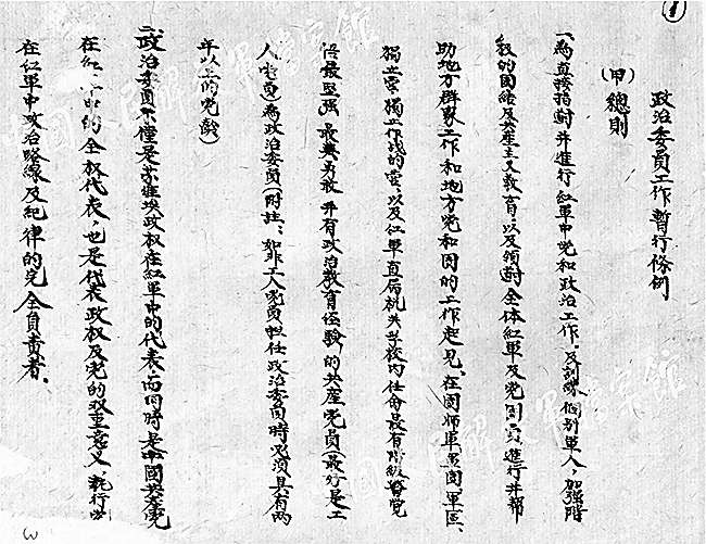 1938年初,在此背景下誕生的《國(guó)民革命軍第十八集團(tuán)軍政治工作暫行條例(草案)》(以下簡(jiǎn)稱《條例》),開宗明義地宣告:“抗日戰(zhàn)爭(zhēng)是一種民族自衛(wèi)的革命戰(zhàn)爭(zhēng),政治工作是這一民族抗戰(zhàn)軍隊(duì)的‘生命線’!”