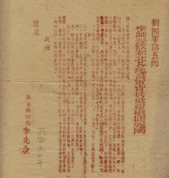 1938年10月武漢淪陷后,中國(guó)共產(chǎn)黨領(lǐng)導(dǎo)的鄂豫地方武裝在敵后浴血抗戰(zhàn),逐步發(fā)展壯大為新四軍第五師(以下簡(jiǎn)稱五師)。這支英雄部隊(duì)長(zhǎng)期孤懸敵后、遠(yuǎn)離主力,深陷日偽頑三方夾擊的困境。在李先念師長(zhǎng)的率領(lǐng)下,五師創(chuàng)造性運(yùn)用統(tǒng)一戰(zhàn)線這一法寶,廣泛團(tuán)結(jié)工農(nóng)群眾、開(kāi)明士紳、國(guó)民黨中的愛(ài)國(guó)人士等進(jìn)步力量,在復(fù)雜斗爭(zhēng)中凝聚抗戰(zhàn)合力。湖北省檔案館保存的一組檔案,真實(shí)見(jiàn)證了五師在敵后抗戰(zhàn)的艱苦環(huán)境中,打破孤立無(wú)援的困局,持續(xù)壯大抗日力量,拓展敵后抗日根據(jù)地的艱辛歷程。