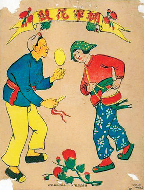 ▲根據(jù)歌曲創(chuàng)作的年畫《擁軍花鼓》?!≠Y料照片