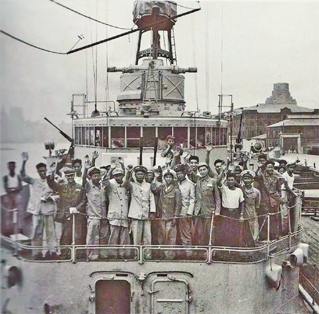 ▲國民黨海軍“長治”艦官兵起義后抵達上海。