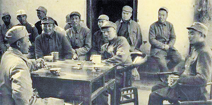 ▲清風(fēng)店戰(zhàn)役后,羅瑞卿同聶榮臻等在前線司令部與被俘的國民黨軍第3軍軍長羅歷戎談話。