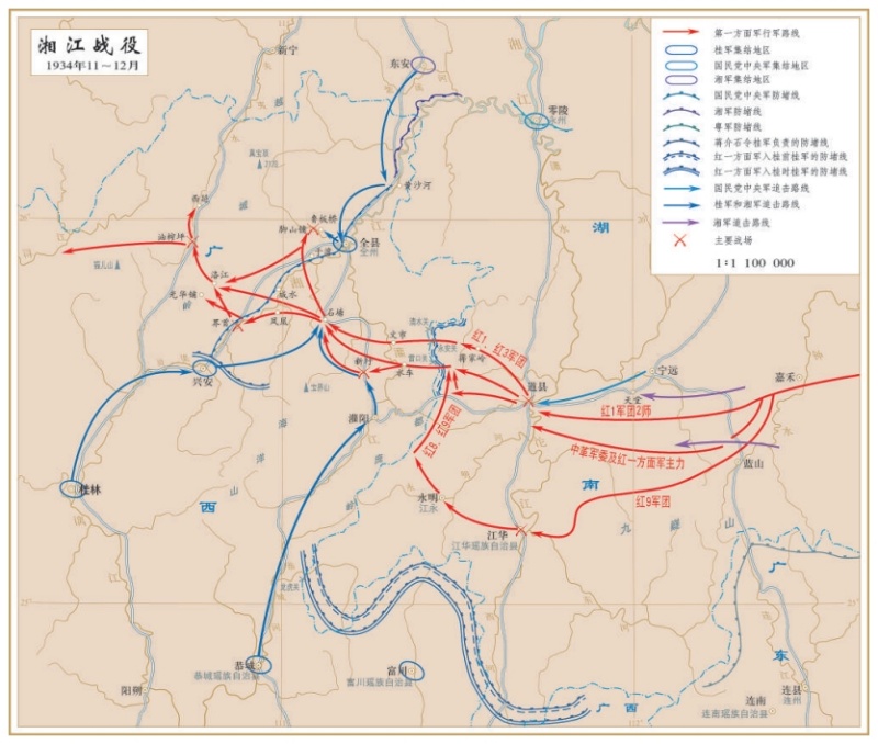 1934年11月25日,中革軍委下令紅軍分4路縱隊(duì),從全州、興安之間強(qiáng)渡湘江,突破第四道封鎖線。11月27日,紅軍先頭部隊(duì)順利渡江,成功控制界首至腳山鋪間的全部渡河點(diǎn)。此時(shí)若紅軍輕裝疾進(jìn),本可以較小損失完成渡江。然而,“左”傾領(lǐng)導(dǎo)者把外線轉(zhuǎn)移變成一次根據(jù)地“大搬家”式的轉(zhuǎn)移,將所有“壇壇罐罐”統(tǒng)統(tǒng)帶上,紅軍大部隊(duì)還要護(hù)衛(wèi)代號“紅星”的軍委第一縱隊(duì)、代號“紅章”的軍委第二縱隊(duì),行軍緩慢,最終錯(cuò)失絕佳戰(zhàn)機(jī)。