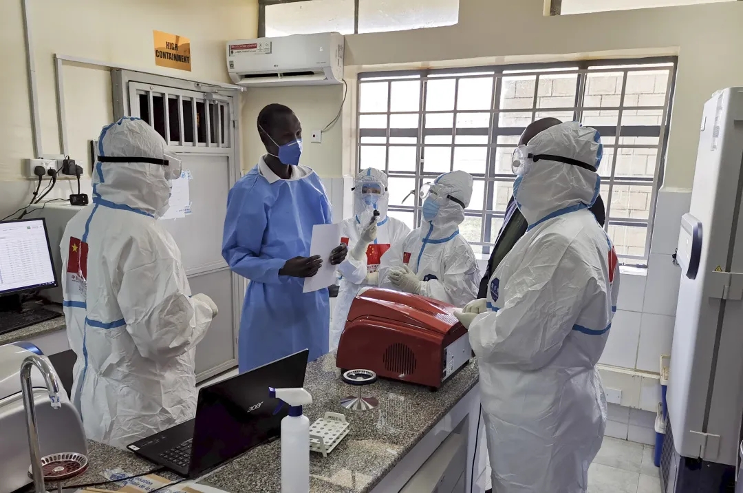 在南蘇丹首都朱巴的一處新冠病毒檢測(cè)機(jī)構(gòu),中國(guó)抗疫醫(yī)療專家組成員與南一線醫(yī)護(hù)人員交流(8月21日攝)。新華社發(fā)(中國(guó)駐南蘇丹大使館供圖)