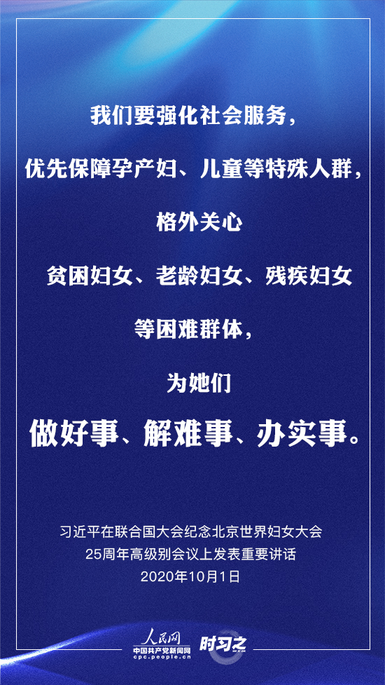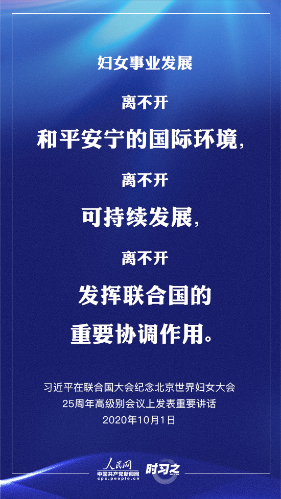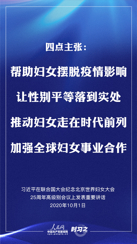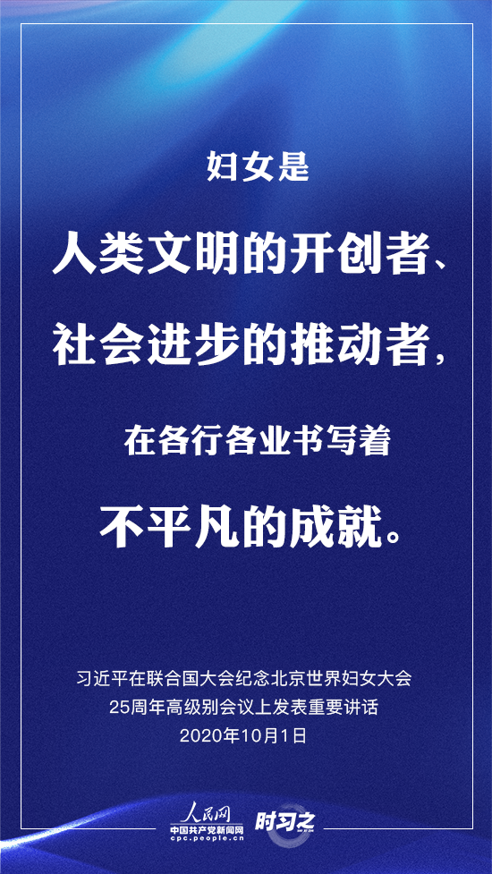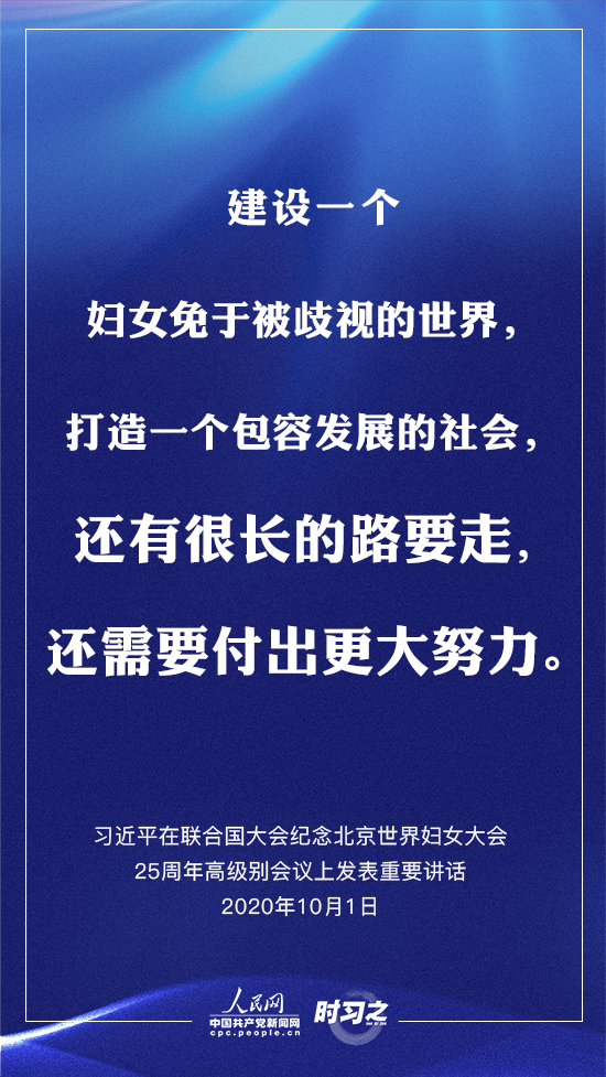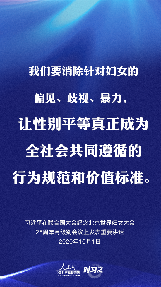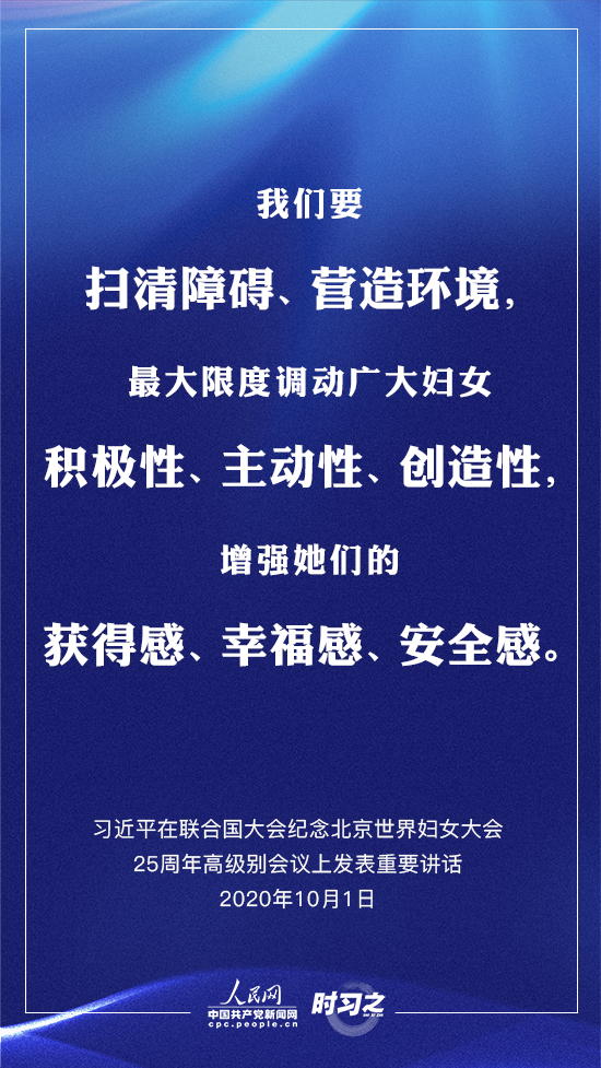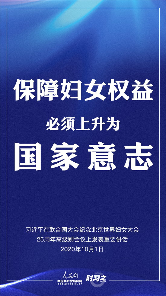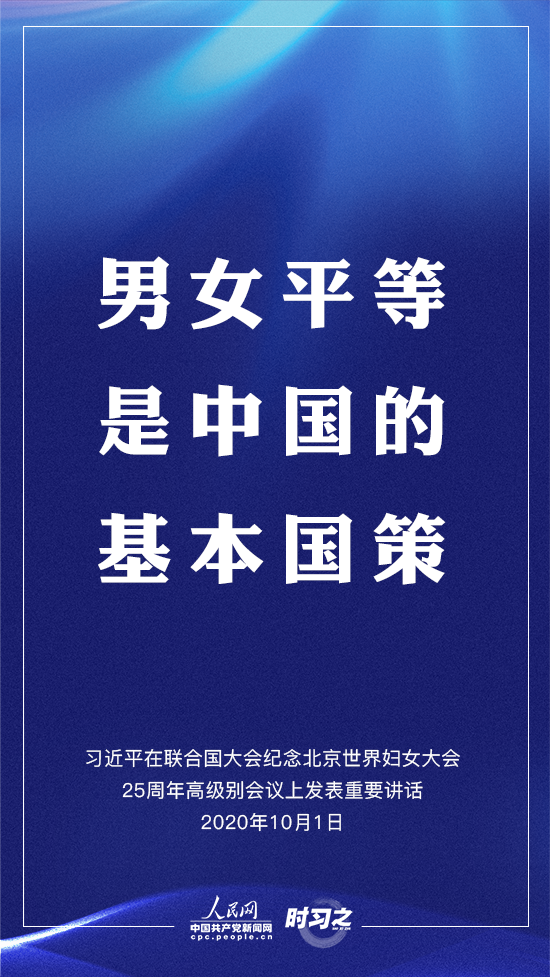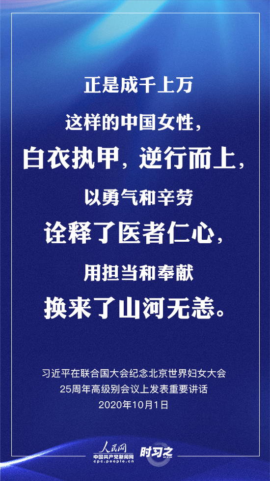 “有一位來(lái)自廣東省的小護(hù)士還不滿20歲。記者問(wèn)她,你還是一個(gè)孩子,還需要?jiǎng)e人幫助。她回答說(shuō),穿上防護(hù)服,我就不是孩子了?!边@是國(guó)家主席習(xí)近平10月1日在聯(lián)合國(guó)大會(huì)紀(jì)念北京世界婦女大會(huì)25周年高級(jí)別會(huì)議上講述的一個(gè)故事。習(xí)近平點(diǎn)贊抗擊疫情斗爭(zhēng)中的中國(guó)女性,為促進(jìn)性別平等提出主張、發(fā)出倡議。人民網(wǎng)·中國(guó)共產(chǎn)黨新聞網(wǎng)“時(shí)習(xí)之”欄目用一組海報(bào),帶您一覽習(xí)近平主席在這場(chǎng)會(huì)議上的重要講話。