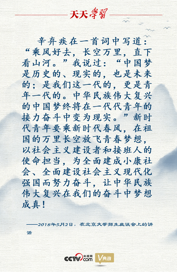 2018年5月2日,在北京大學(xué)師生座談會(huì)上,習(xí)近平總書(shū)記引用了辛棄疾這句意境宏闊的中秋詞句,號(hào)召新時(shí)代青年要乘新時(shí)代春風(fēng),在祖國(guó)的萬(wàn)里長(zhǎng)空放飛青春夢(mèng)想。