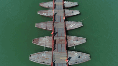 △廣濟(jì)橋中間有18艘木船。(總臺(tái)央視記者黃東旭、趙晨拍攝)