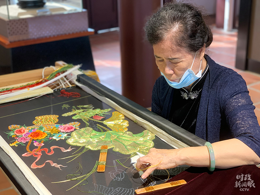 △目前廣濟(jì)樓樓內(nèi)一、二樓分別辟為“潮州通史展”和“潮州非物質(zhì)文化遺產(chǎn)陳列展”展廳。這是潮州刺繡。(總臺(tái)央視記者郭晗光拍攝)