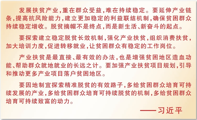 一系列強(qiáng)有力的政策舉措落地生根,一大批特色產(chǎn)業(yè)在貧困地區(qū)拔節(jié)成長。產(chǎn)業(yè)興了,村民富了,山村活了,832個(gè)貧困縣每個(gè)縣都有了主導(dǎo)產(chǎn)業(yè),90%的貧困人口參與富民產(chǎn)業(yè),日子越過越紅火。