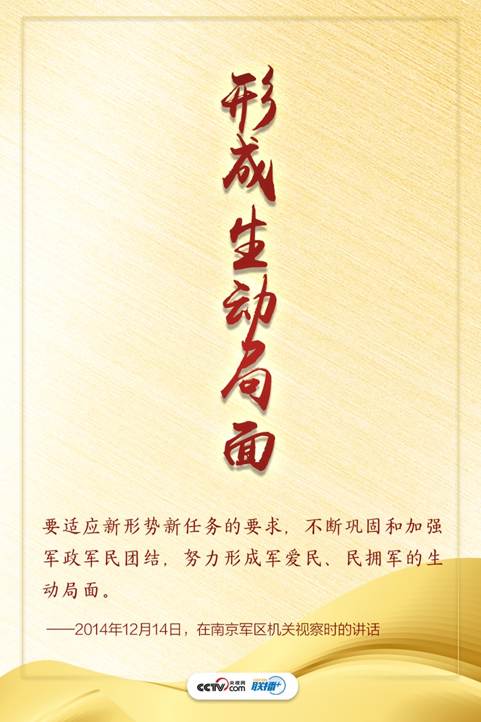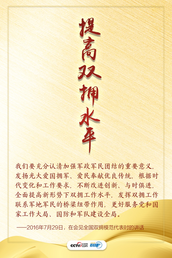 習(xí)近平總書記始終高度重視雙擁工作,多次在重要會(huì)議、國內(nèi)考察時(shí)親力親為指導(dǎo)推動(dòng)。他強(qiáng)調(diào)擁軍優(yōu)屬、擁政愛民是我黨我軍特有的政治優(yōu)勢,堅(jiān)如磐石的軍政軍民關(guān)系是我們戰(zhàn)勝一切艱難險(xiǎn)阻、不斷從勝利走向勝利的重要法寶。