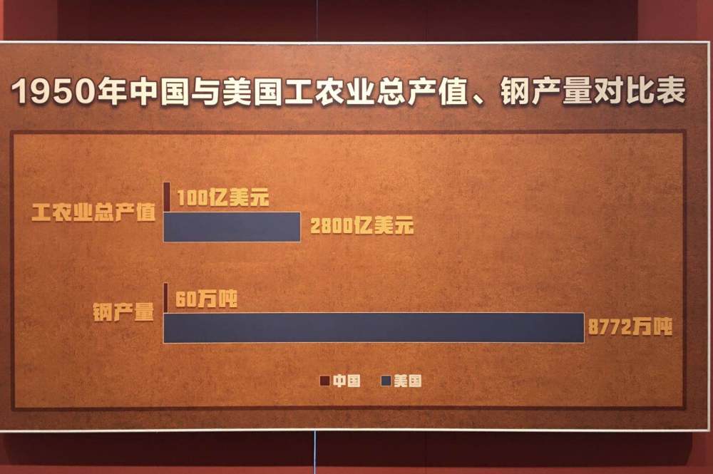 展廳里,一張對(duì)比圖,直觀展現(xiàn)了當(dāng)時(shí)中美兩國(guó)在硬實(shí)力方面的巨大差距。