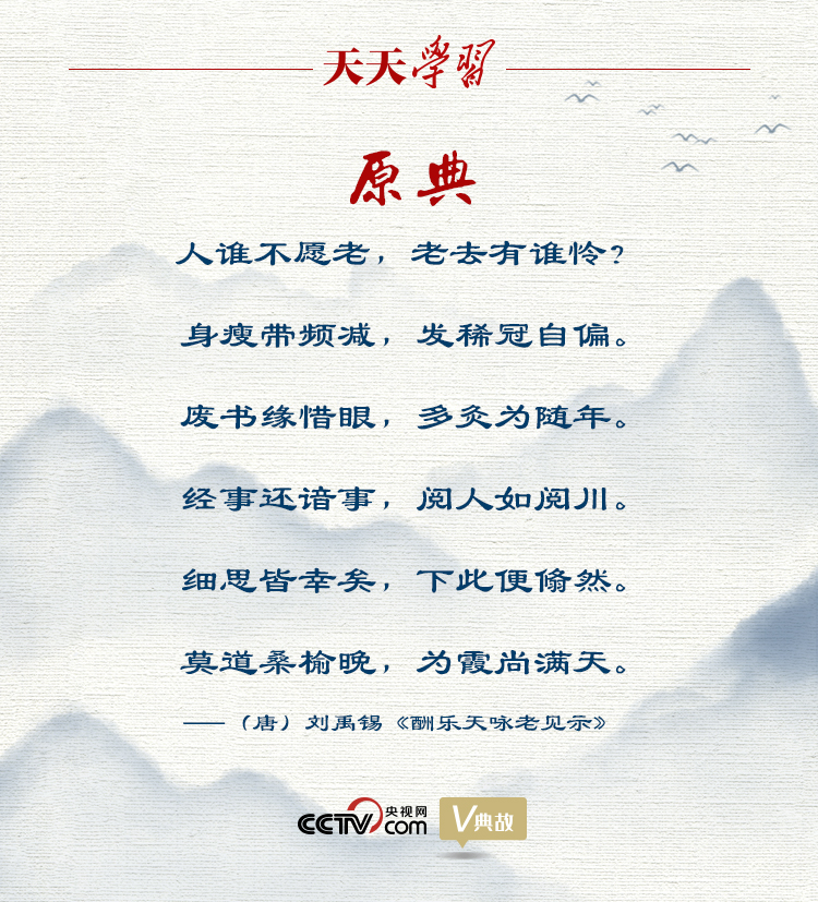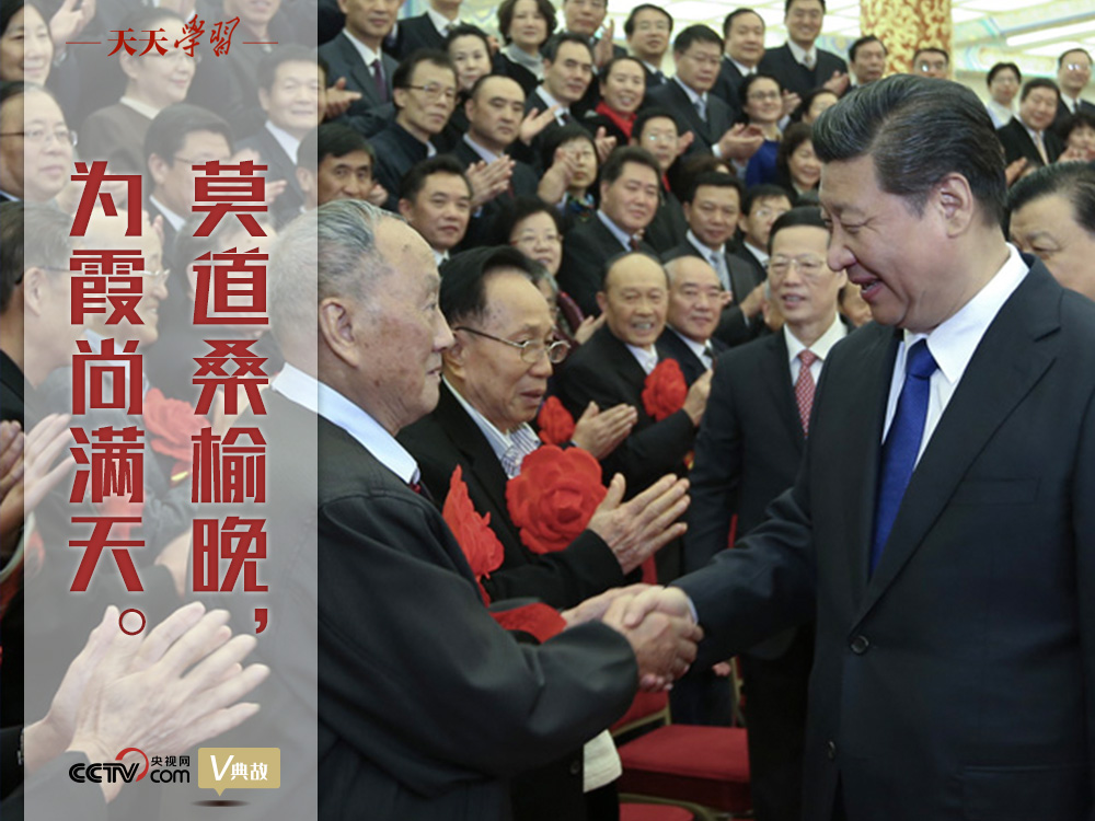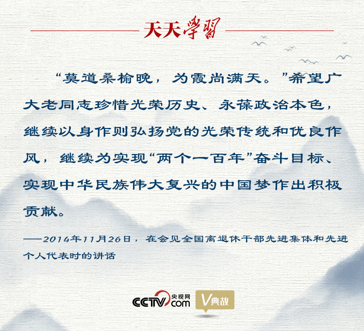 “莫道桑榆晚,為霞尚滿天?!?014年11月26日,習(xí)近平總書(shū)記在會(huì)見(jiàn)全國(guó)離退休干部先進(jìn)集體和先進(jìn)個(gè)人代表時(shí),用劉禹錫的詩(shī)句鼓勵(lì)廣大老同志繼續(xù)發(fā)揮余熱,作出積極貢獻(xiàn)。