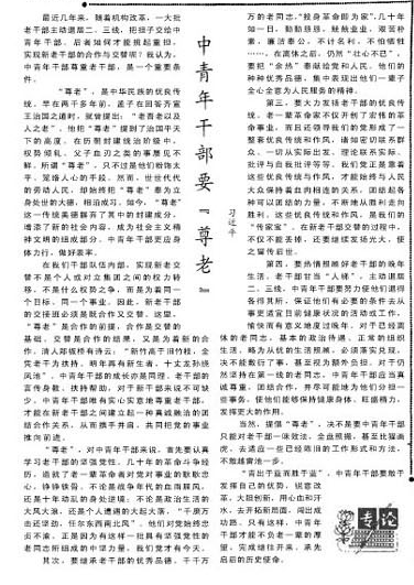 1984年12月7日,習(xí)近平同志在《人民日?qǐng)?bào)》發(fā)表一篇題為《中青年干部要“尊老”》的專(zhuān)論,文章充滿深情地說(shuō):“千千萬(wàn)萬(wàn)的老同志,‘投身革命即為家’,幾十年如一日,勤勤懇懇,兢兢業(yè)業(yè),艱苦樸素,廉潔奉公,不計(jì)名利,不怕?tīng)奚?,在離休之后,仍然‘壯心不已’,要把‘余熱’奉獻(xiàn)給黨和人民。他們的種種優(yōu)秀品德,集中表現(xiàn)出他們一輩子全心全意為人民服務(wù)的精神。”