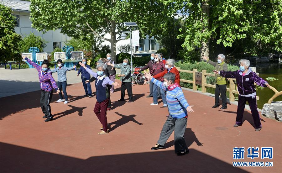 北京海淀區(qū)四季青鎮(zhèn)敬老院的老人們?cè)趯W(xué)習(xí)跳舞(2020年5月10日攝)。新華社記者 李欣 攝