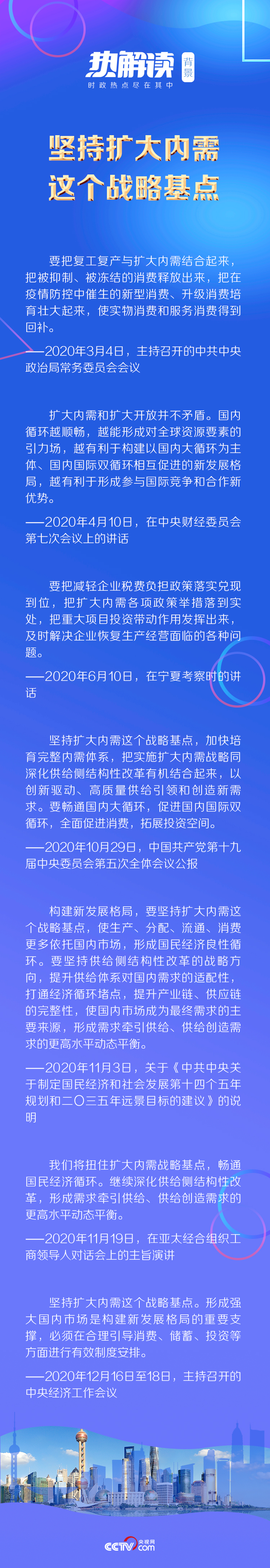 《熱解讀》梳理發(fā)現(xiàn),“擴(kuò)大內(nèi)需”一詞在今年的高層會(huì)議中被反復(fù)提及,3月4日召開的中共中央政治局常務(wù)委員會(huì)會(huì)議指出“要把復(fù)工復(fù)產(chǎn)與擴(kuò)大內(nèi)需結(jié)合起來,把被抑制、被凍結(jié)的消費(fèi)釋放出來”;9月8日,習(xí)近平總書記在全國抗擊新冠肺炎疫情表彰大會(huì)上強(qiáng)調(diào)“牢牢把握擴(kuò)大內(nèi)需這個(gè)戰(zhàn)略基點(diǎn),保護(hù)和激發(fā)市場主體活力”;黨的十九屆五中全會(huì)提出“堅(jiān)持?jǐn)U大內(nèi)需這個(gè)戰(zhàn)略基點(diǎn),加快培育完整內(nèi)需體系,把實(shí)施擴(kuò)大內(nèi)需戰(zhàn)略同深化供給側(cè)結(jié)構(gòu)性改革有機(jī)結(jié)合起來,以創(chuàng)新驅(qū)動(dòng)、高質(zhì)量供給引領(lǐng)和創(chuàng)造新需求”……