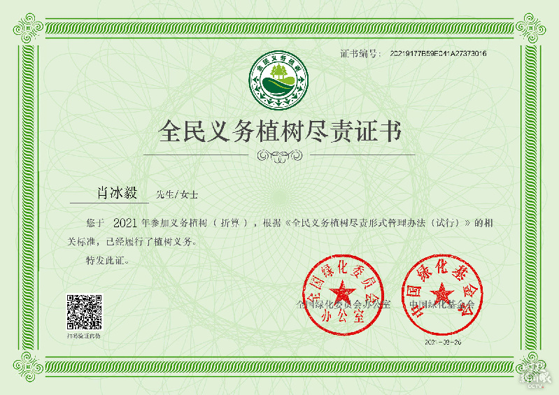 △通過網(wǎng)絡(luò)捐款開展國土綠化、植樹造林相關(guān)項目,完成植樹義務(wù)后,可以獲得《全民義務(wù)植樹盡責(zé)證書》。(總臺央視記者肖冰毅提供)