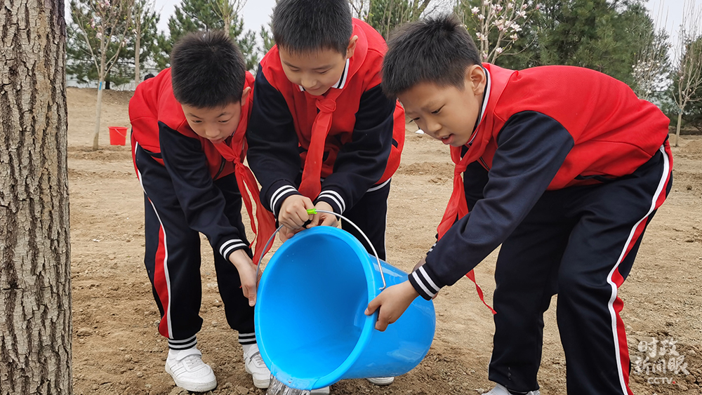 △少先隊員拎桶澆水。(總臺央視記者范凱拍攝)