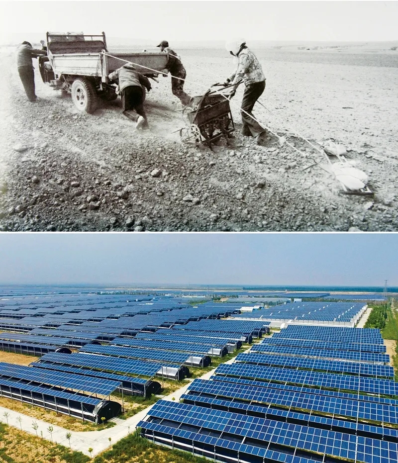 東西部扶貧協(xié)作創(chuàng)奇跡,寧夏閩寧鎮(zhèn)舊貌換新顏。自福建與寧夏結(jié)成幫扶對子以來,20多年間通過資金支持、引入項(xiàng)目、培訓(xùn)技能、幫扶產(chǎn)業(yè)等多方面舉措,在戈壁旱塬間書寫下閩寧扶貧協(xié)作的壯麗篇章。上圖為寧夏永寧縣閩寧鎮(zhèn)建設(shè)初期,移民群眾在戈壁灘上開荒種田(資料照片 新華社發(fā))。下圖為閩寧鎮(zhèn)原隆移民村的光伏蔬菜大棚(新華社記者 王鵬/攝)。