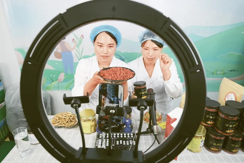 “閩寧禾美”是在閩寧扶貧協(xié)作推動下,在寧夏閩寧鎮(zhèn)原隆村建設(shè)的一個(gè)消費(fèi)扶貧品牌和電商孵化基地。該基地通過“企業(yè)+扶貧車間+貧困戶”的模式,引領(lǐng)特色產(chǎn)業(yè)發(fā)展,讓村民就近就業(yè),穩(wěn)定脫貧致富。圖為2020年6月11日,村民在家門口的電商扶貧車間直播銷售當(dāng)?shù)靥厣r(nóng)產(chǎn)品。中新社記者 于晶/攝