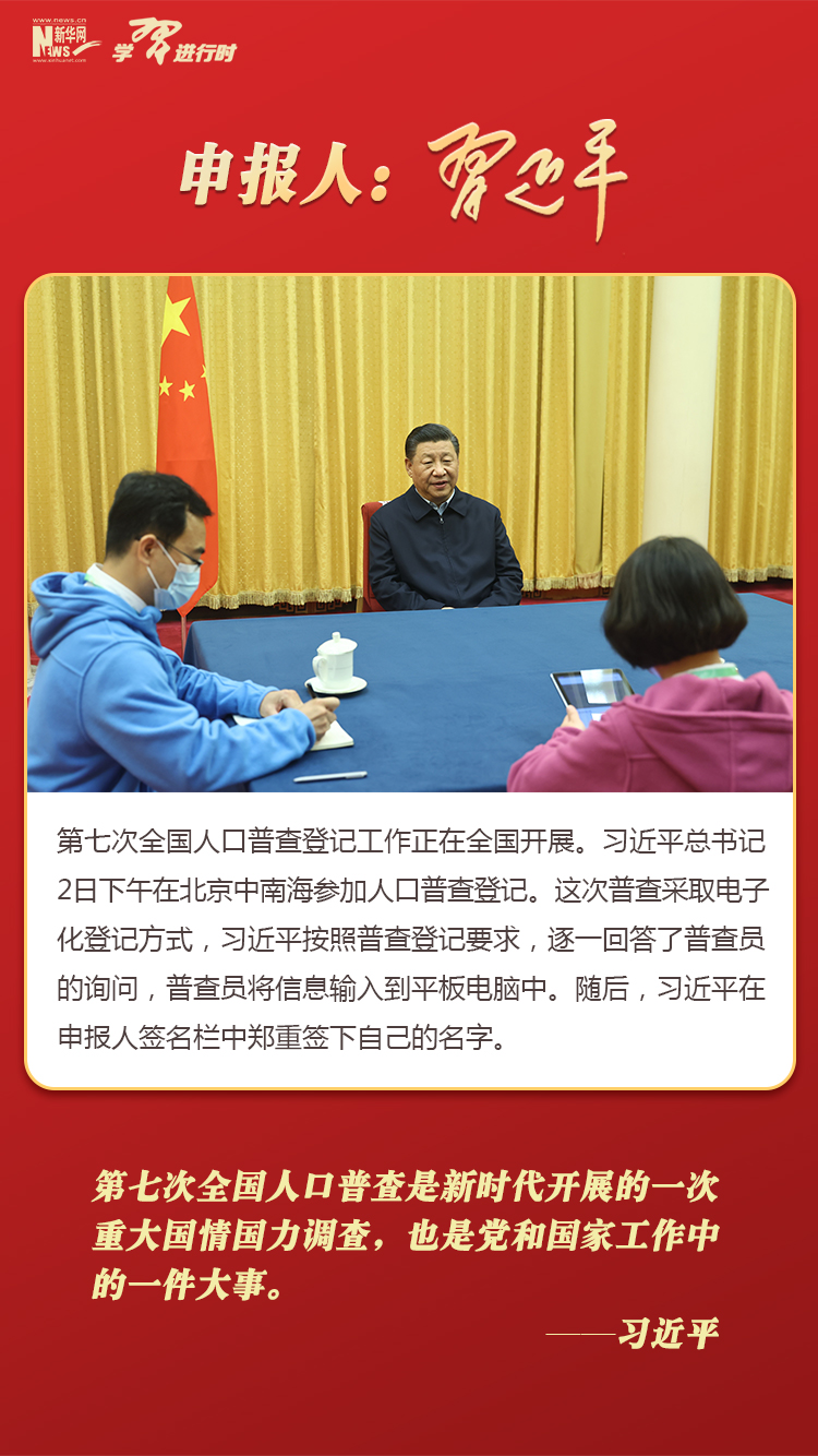 習(xí)近平在北京中南海參加全國人口普查登記,帶頭申報。他按照普查登記要求,逐一回答了普查員的詢問,并在申報人簽名欄中鄭重簽下自己的名字。