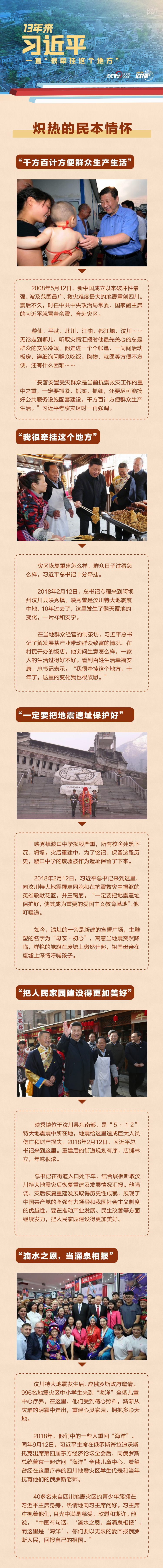 今年5月12日是汶川地震13周年紀念日。汶川地震發(fā)生后不久,時任中共中央政治局常委、國家副主席的習(xí)近平就冒著余震,奔赴災(zāi)區(qū)。多年來,習(xí)近平一直“很牽掛這個地方”,關(guān)心災(zāi)區(qū)居民和災(zāi)后恢復(fù)重建發(fā)展情況;出訪俄羅斯時還特意看望曾經(jīng)在“海洋”全俄兒童中心療養(yǎng)的四川地震災(zāi)區(qū)學(xué)生代表。